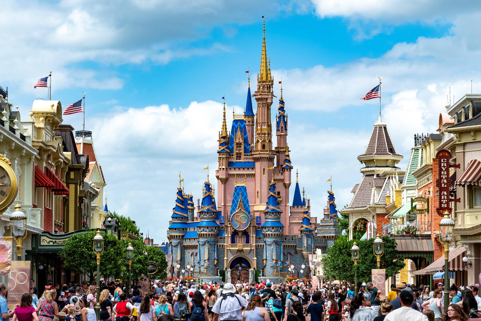 - Main Street, U.S.A. - As soon as you step into the park, you are on this nostalgic street full of brick facades, stores and old-fashioned details. Walt Disney based this area on his childhood memories of Marceline, Missouri. Thanks to clever architecture, the buildings appear taller than they are.